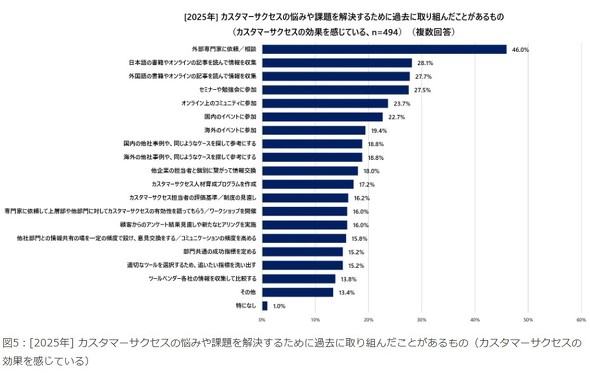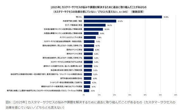 カスタマーサクセスの導入・運用上の課題を解決するために過去に取り組んだことを聞くと、効果実感層では「外部専門家に依頼/相談」が46.0%と際立って高かった。「日本語・外国語の書籍やオンライン記事の情報収集」「セミナーや勉強会への参加」「オンラインコミュニティへの参加」など、複数のチャネルを活用して知見を得ようとする姿勢が特徴的だった。