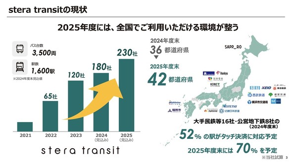タッチ決済による公共交通機関向けソリューション「stera transit」は、2024年度末には全国約180社、2025年度には230社の交通事業者への導入が見込まれている。現在は月間約350万件の利用があり、すでに183カ国のカードが利用されている。石塚氏は「数年先にはこの350万件が、数億件レベルまで拡大する」と予想する。