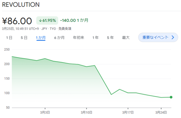 ところが、レボリューションは初回優待実施を目前に控えた2025年3月上旬、「株主優待の廃止」を突如として発表した。通常、優待導入を決める際は少なくとも半年〜1年程度は実施したうえで内容やコストを再検討するのが通例であり、導入前に廃止となるケースは異例中の異例だ。