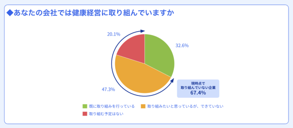 会計SaaSサービスを提供するフリー(東京都品川区)は、健康経営の実態調査を実施した。調査から67.4%の企業が、現時点で「健康経営に取り組んでいない」(「取り組みたいと思っているが、できていない」と「取り組む予定がない」の合算)ことが分かった。