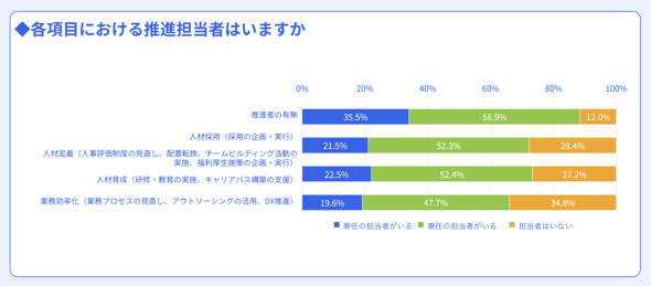 人材定着・人材育成・業務効率化に関して、専任または兼任の担当者がいないと回答した企業が約3割に上った。特に、人材定着の専任または兼任の担当者がいない割合は28.4%であり、人材採用の12.0%と比べて2倍以上の差がみられた。