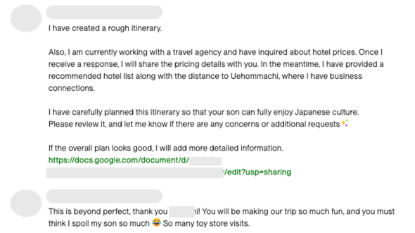 Upwork上の多くの職種が未経験だったもなみんさん。他の人を参考にしながら自分のプロフィールを作成し、経験を積むためできるかぎり多くの案件に応募。訪日する外国人観光客の旅程を組む仕事や、日本でビジネスを始めようとしている人のためのリサーチ業務など、さまざまな仕事に挑戦した。その中で、自身のスキルと経験を最も生かせると感じ、現在もメインの仕事として続けているのが「オンライン秘書」だ。