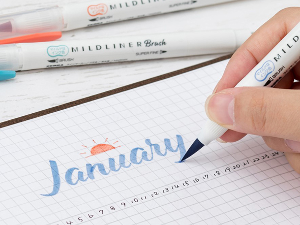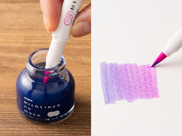 ラインアップは大きく3種類ある。2025年で発売16年目を迎え、1月に新色が加わった「マイルドライナー」(全40色)、2019年より発売している筆ペンタイプの「マイルドライナーブラッシュ」(全25色)。そして2024年に発売したペンと違う色のインクを直接付けて楽しむ「マイルドライナーのもと」(全9色)だ。