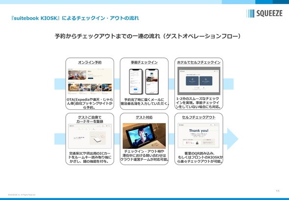 SQUEEZEは、JR東日本グループの新ホテルブランド「B4T」で、自社開発のクラウド型ホテル管理システム「suitebook KIOSK」とSuicaスマートロックを連携させ、ゲスト自身が交通系ICカードをルームキーとして活用できるセルフチェックイン機能を実現した。
