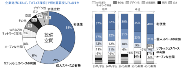 オフィス環境の中で重視している点は、求職者と企業の間でギャップが見られた。ツナグ働き方研究所は「超売り手市場である現在は、求職者側が重要視している『利便性と個人スペースの確保』を実現することが、採用力の強化につながる」とコメントしている。