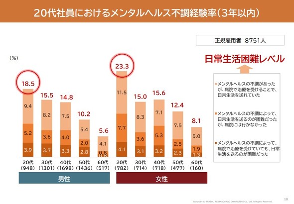 また、パーソル総合研究所の調査によると、20代正規雇用者の中でメンタル不調を経験した割合は男性で18.5%、女性では23.3%に達し、正規雇用者の5人に1人が過去3年以内に「日常生活困難レベル」のメンタル不調を経験していることになる。