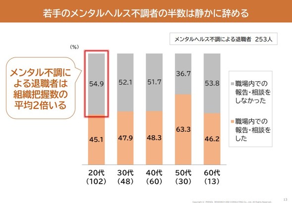 メンタル不調で退職する若手の半数以上が職場にその理由を伝えずに去っていくという。つまり、企業が把握しているメンタル不調による離職者数は、実際の半数程度に過ぎない可能性がある。