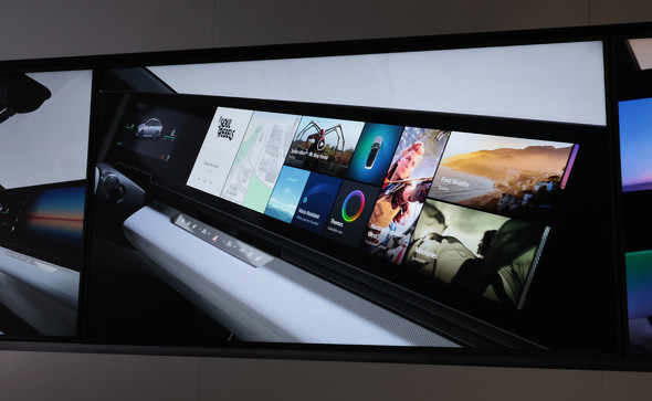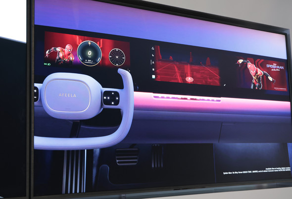 AFEELA 1のダッシュボードにはメーターパネルと連続した大画面の液晶モニターが備わり、映画などのエンタメを楽しむことができる。ここまではどこでも思い付くレベルだが、SDVであることによって、ここから先の広がりも期待できる(筆者撮影)