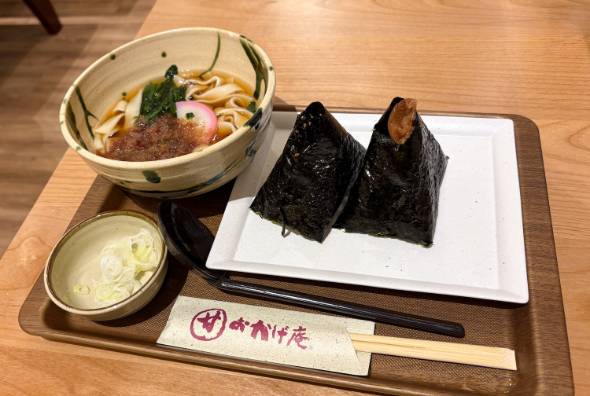 おかげ庵で、日替わりおむすび2個ときしめん(ハーフサイズ)のセット商品を注文して、おにぎりを食べてみた。サイズ感はコンビニのおにぎり(約100〜120グラム)よりやや大きめな印象で、ご飯の旨みやふんわり感とたっぷりの具材が特徴的だった。