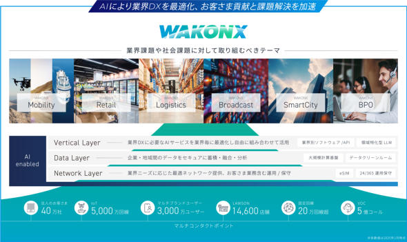 KDDIは2024年5月、DX推進を基盤とした新たなビジネスプラットフォーム「WAKONX」(ワコンクロス)を立ち上げた。「和魂洋才」から生まれたもので、背景には、日本の人口減少や業界課題の深刻化、生成AIの急速な進展など、社会変化への対応がある。
