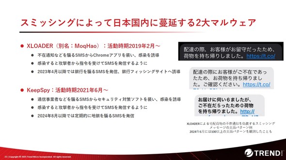 さらにフィッシング詐欺の主戦場がPCからスマートフォンへと急速に移行している。特に「スミッシング」と呼ばれるSMSを利用した詐欺が拡大しており、国内では「XLOADER」と「KeepSpy」という2つの不正アプリが大きな脅威となっている。