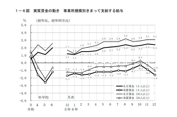 実質賃金(賃金上昇−物価上昇)の定例支給分に関しては、ここ数年ずっとマイナスで推移している。大企業を中心に賃上げが進んだことでマイナス幅は縮小傾向にあるが、中小企業勤務者に関しては依然として水面下から浮上していない(図表4)。数年間続いているその累積を考えると、消費者の財布はコロナ前に比べてかなり目減りしているのが実態だ。