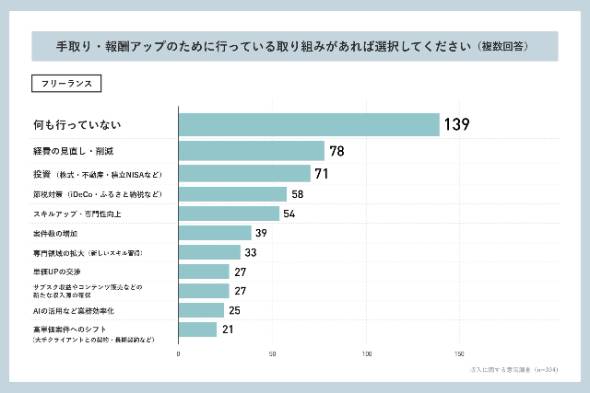 報酬アップのための取り組みをしているかについては、「何も行っていない」と回答した人が最も多く、会社員は29.16%、フリーランスは24.30%だった。その後はフリーランスでは「経費の見直し・削減」、「株式・不動産・積立NISAなどの投資」が続いた。全体的にスキルアップや報酬単価の向上を目指して自己研さんをしたり、将来へ投資したりする姿勢がうかがえる。