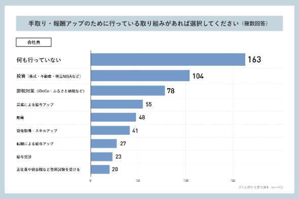会社員では「株式・不動産・積立NISAなどの投資」「iDeCoやふるさと納税などの節税対策」への関心が高く、昇進や副業による収入アップを目指す傾向が見られた。