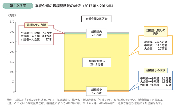 これは2016年時点で、廃業せずに存続している事業者295万社が、4年前の2012年からどれほど、従業員を増やすなどして企業規模を拡大させてきたのかを調べたものである。それによると、規模拡大に成功したのはなんと7.3万社のみで、95%に当たる281.3万社が「規模変化なし」だったのだ。