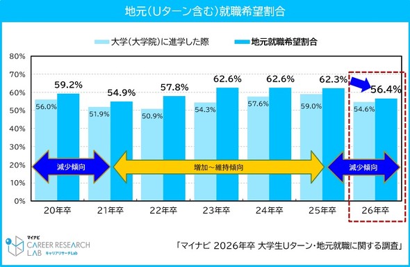 マイナビ(東京都千代田区)が2026年卒業予定の全国の大学生、大学院生を対象に実施した調査によると、地元就職(Uターンを含む)を希望する学生が4年ぶりに6割を下回ったことが分かった。