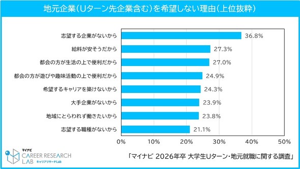 地元就職を希望しない理由は「志望する企業がないから」(36.8%)が最も多く、次いで「給料が安そうだから」(27.3%)が挙がった。自由回答では「より良い給料の企業に就職したい」「希望する業種や職種の仕事に就きたい」といったコメントがあった。また、今は地元就職を希望しないという学生の中にも、「都会でスキルを積み、将来は地元に戻りたい」という意見もあった。