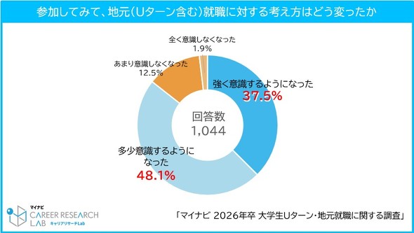 「地元就職のためにインターンシップ・仕事体験に参加したことがある」学生の割合は33.8%だった。そのうち85.6%の学生は、インターンシップや仕事体験に参加して「地元就職を意識するようになった」と回答した。