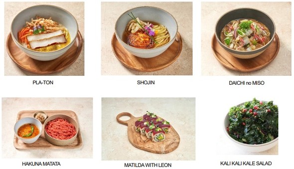 主なメニューは、豆腐チャーシューやニンジンのマリネなどをのせた豚骨ラーメン「PLA-TON」や、グリルトマトや玉ねぎの天ぷらなどをのせたしょうゆラーメン「SHOJIN」など。ラーメン以外では、巻きずし「MATILDA WITH LEON」やケールサラダなどを提供する。
