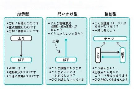 組織における上司と部下のコミュニケーションは、次の図で示すように「指示型」「問いかけ型」「協創型」の3つのスタイルで考えることができます。