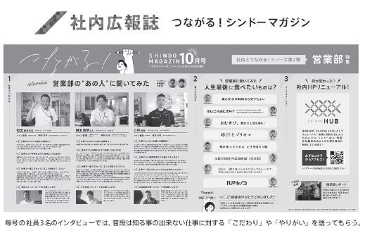 社内報は、会社や同僚のことを「気になるな」「好きだな」と思ってもらえるよう、“社員がつながること”と、“自社らしさの探求”をキーワードに、『つながる ! シンドーマガジン』を立ち上げました。更新は月に1回です。