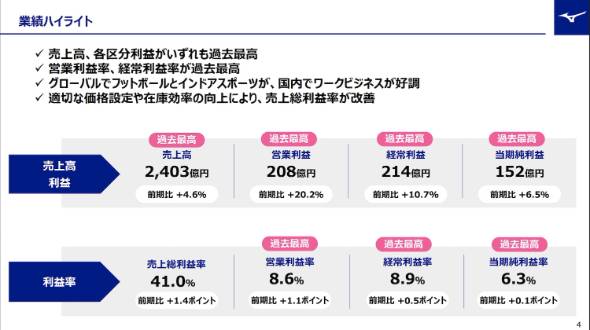 ミズノの2025年3月期決算を見ると、売上高2403億円(前期比4.6%増)、営業利益208億円(同20.2%増)となり、いずれも過去最高を記録した。
