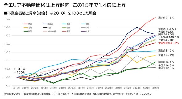 不動産価格の上昇に対して給与の上昇率が追い付いておらず、今後、住宅購入を検討する人の多くが、従来よりも予算を抑えざるを得ない状況になると予想されます。地域別に見ると、東京は2010年と比較して約1.7倍、全国平均は約1.4倍。当時と比較して下がっているエリアはありません。