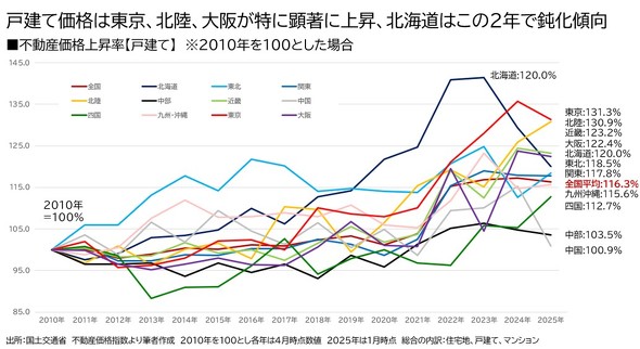 次は戸建てとマンションに分けて見ていきましょう。戸建てはマンションほど上昇しておらず、全国平均は2010年対比116%です。2023年からこの2年間は各エリアとも減少傾向にあり、特に北海道の下がり幅が顕著でした。タワーマンションの建設ラッシュや建設工事費の高騰が影響していることがうかがえます。一方で北海道のマンション価格は約3倍となり、全国平均の2.1倍を大きく上回ります(2010年対比)。