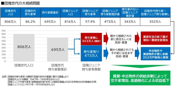 さらに、今後10年で大きな変化をもたらすのが団塊世代の相続です。団塊世代の持ち家を団塊ジュニア世代に相続した場合に起きる事象を整理したのが次の図です。