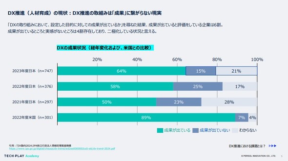 情報処理推進機構(IPA)の「DX動向2024」によると、DX推進の取り組みについて「成果が出ている」と回答した企業は2023年度で64%。2021年度の50%から改善しているものの、米国の89%と比較すると依然として大きな差がある。