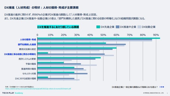 こうした格差の背景には人材育成の課題がある。DX推進の阻害要因として約9割の企業が「人材の獲得・育成」を挙げており、「部門を横断した連携」「DX推進に係る役割と責任の明確化」などの組織問題が顕著に表れている。