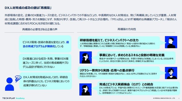 こうした状況から、生成AIなどの技術変化で過去の育成プログラムが陳腐化したり、DX推進が小さな成功から組織的な取り組みへとフェーズが変わったりする中で、従来の研修内容や手法を根本から見直す「再構築」が求められている。