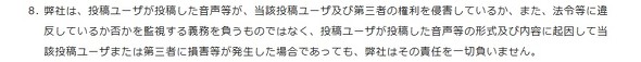 なお、ボイスキャリアの利用規約には、投稿された音声に関して第三者との間に紛争が生じた場合、「投稿ユーザーの費用と責任で解決する」と記されています。その内容が法令に抵触しているかどうかについて、運営側が監視・確認する義務はなく、ユーザーや第三者に損害が生じた場合でも「責任を一切負わない」としているようです。