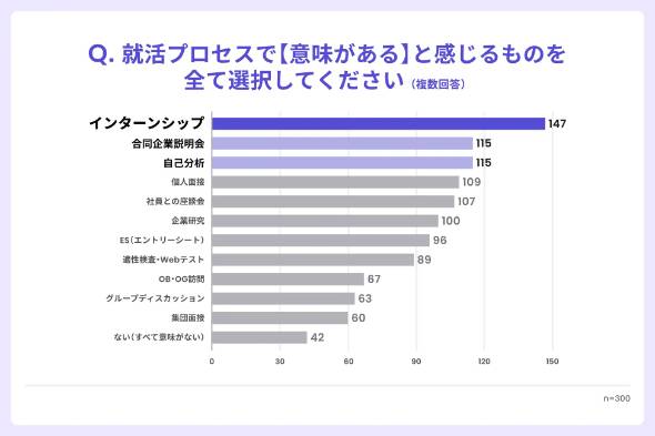 就活プロセスに対しては、特に「インターンシップ」(147人)、「合同企業説明会」(115人)、「自己分析」(115人)などに意義を感じる学生が多かった。