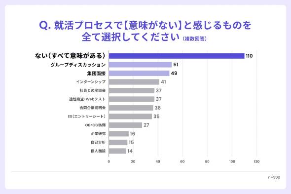 一方、「グループディスカッション」(51人)や「集団面接」(49人)を「意味がない」と感じる学生も一定数いた。一方「全て意味がある」(110人)と考える学生も多い。
