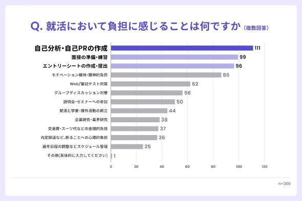 就活で負担に感じることについては、「自己分析・自己PRの作成」(111人)が最も多く、「面接の準備・練習」(99人)、「エントリーシートの作成・提出」(96人)が続いた。就活プロセスに関する調査で自己分析の重要性を認めつつも、自分と向き合うことへの大変さを感じる就活生特有のジレンマもあるようだ。