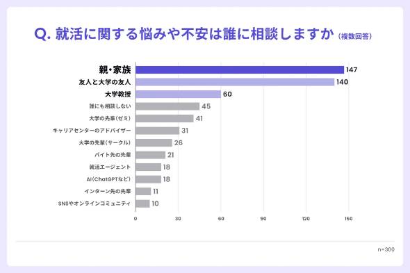 就活の悩みや不安の相談相手については、「親・家族」(147人)、「友人と大学の友人」(140人)が他との差を大きく広げて上位に入った。一方、「AI(ChatGPTなど)」(18人)や「SNSやオンラインコミュニティ」(10人)などのデジタルツールを活用する人は少数となっている。