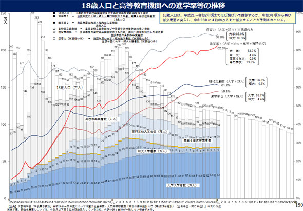 では、赤本はどういったときに売れて、どういったときに苦戦するのか。18歳の人口を見ると、2005年には約137万人だったが、2023年には約112万人まで減少している。「少子化=部数減」と思いきや、そうでもないようだ。大学入学者や進学率は伸びているので、人口の減少分を補ってきた。