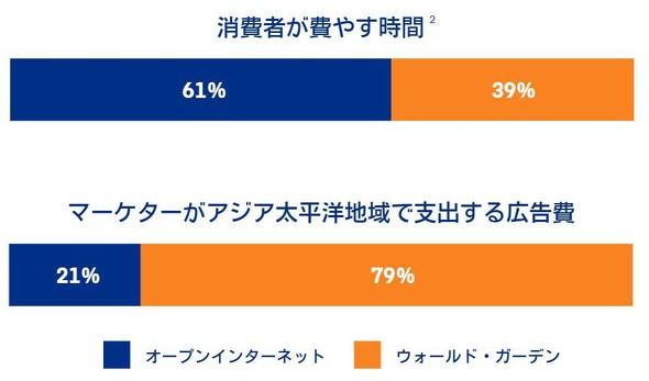 なお、広告主がウォールドガーデンに依存するのは日本に限った傾向ではありません。消費者は6割の時間をオープンインターネットで費やしているにもかかわらず、マーケターが支出する広告費の8割近くはウォールドガーデンに投下されています。