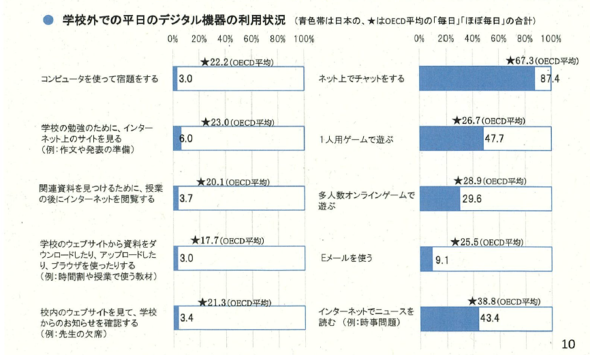 一方、学校外で宿題や課題のために関連資料を見つける作業はほとんどしていない。つまり遊びで使っているけれども、勉学のための利用はほぼゼロです。