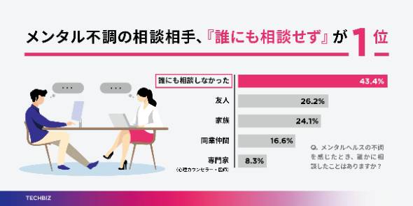 メンタル不調を感じた際の相談相手については、「誰にも相談しなかった」と答えた人が43.4%で最多に。2位の「友人」(26.2%)を大きく上回った。