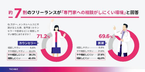 メンタル不調時にカウンセラーに相談しにくいと感じる人は71.2%。医師に相談しにくいと感じる人も69.6%に上った。専門的な支援を相談しやすい環境ではないことが、メンタル不調の悪循環を招いていると考えられる。