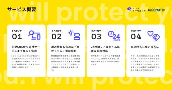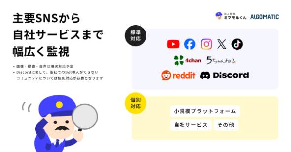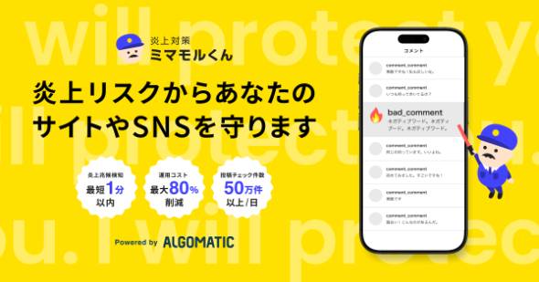 生成AI技術を活用したサービスを提供するAlgomatic(東京都港区)は、炎上対策AIエージェント「炎上対策ミマモルくん」β版の提供を開始した。炎上の兆候検知から対策までを自動化。平常時のリスク防止と、炎上発生時の被害極小化を実現する。