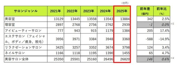 リクルートは6月26日、美容サロンの実態に関する調査結果を発表した。美容室の市場規模は過去5年で最大になった一方、脱毛サロンの市場規模は2021年から672億円減少した。