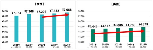 美容室の市場規模は、過去5年で最大の1兆3884億円(前年比2.5%増)に達した。1回当たりの利用額も男女ともに増加しており、女性は7668円、男性は4879円に上った。同社研究員によると、物価高の他に「縮毛矯正」などの高単価メニューや、「まつげメニュー」などを併せて提案する「クロスセル」の広がりが影響しているという。