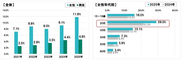 まつ毛パーマ、まつ毛エクステンション、眉カットなどを行うアイビューティーサロンの市場規模は、ここ2年で急拡大し1384億円(同17.4%増)に達した。男女ともに利用率が増加しており、特に20代女性の約3割が1年以内に利用した。