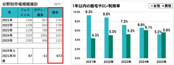 エステサロン(フェイシャル、ボディー/細身、脱毛)の市場規模は、前年比マイナス588億円の3360億円だった。中でも、脱毛サロンの市場規模は2021年から672億円減少した。近年の大手脱毛サロンの倒産や、医療脱毛やセルフ脱毛などの選択肢の増加による影響が考えられ、女性の1年以内の脱毛サロン利用率は、5年間で4.1%低下しているという。