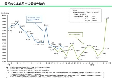 前段として、農林水産省の「長期的な主食用米の価格の動向」を見てみましょう。2023年のコメの相対取引価格は、食用玄米60キロ当たりで1万5315円。これが、2025年4月には2万7102円と2倍近くになっています。消費者物価指数(2020年基準、全国)も、この4月に東京都区部ではパンが125.6、めん類が121.3に対してコメ類は202.8とおよそ2倍に跳ね上がっています。確かにコメ価格は高くなりすぎている状況でした。