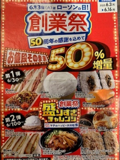 ローソンでは6月3日から価格据え置きで具材や重量などを約50%増量した「盛りすぎチャレンジ」を実施しています。同社の好評企画で、今回が5回目の開催です。キャンペーン期間中の1店舗当たり平均来店客数は、前年対比で約5%増(同社調べ)になるということ。今回は50周年企画としておよそ1カ月にわたり開催するため、これまで以上の効果となるでしょう。