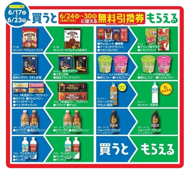 ファミリーマートは、対象商品を1個買うと対象の商品と引き換えられる無料引換券(レシートクーポン)を1枚プレゼントするという、こちらも定番の企画を実施。買いたいものが対象商品に入っていれば、無料でもらえるお得な企画です。次回来店につながるだけでなく別の商品購入にもつながりやすく、客数を増やして売り上げを高める効果のある良い企画です。